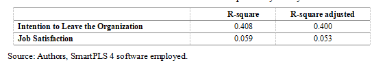 The R2 result for the construct Intention to Leave the Organization is 0.408, indicating that the research model demonstrates moderate to substantial predictive ability for the mentioned variable. In contrast, the R2 result for construct Job Satisfaction is 0.059, suggesting that the constructed research model exhibits weak predictive ability in explaining this variable.