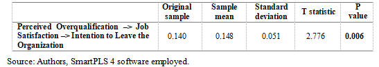 Last but not least, the findings shown in Table 9 undoubtedly reveal whether the variable Job Satisfaction mediates the relationship between the variables Perceived Overqualification and Intention to Leave the Organization. This effect appears to be statistically significant (β=0.140, t=2.776, p=0.006; p<0.05 and p<0.01), which consequently provides sufficient evidence for the acceptance of the H04 hypothesis.