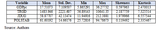 The variables listed in Table 1 will be used in the regression model where the dependent variable is GDPpc, while the independent variables are POLSTAB, TROD, and JDUG: