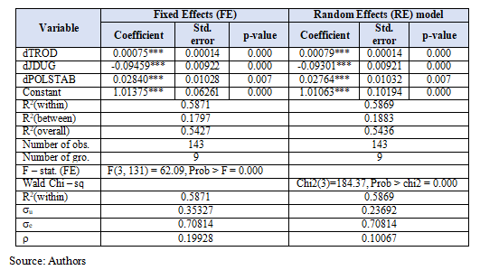 The next step in the analysis is to choose the appropriate model between the Fixed Effects (FE) model and the Random Effects (RE) model. First, we estimated the Fixed Effects (FE) model using the command xtreg (xtreg var1,..varn, fe), after which the obtained results were saved (estimate store fe). The same procedure was applied for the Random Effects (RE) model.