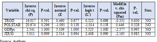 The next step in the analysis was to test the stationarity of the time series variables using the Fisher test (Dickey-Fuller tests), which is a first-generation unit root test. In this test, the null hypothesis is H0 – all panels contain a unit root, while the alternative is Ha – at least one panel is stationary.