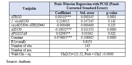 When we applied the Prais-Winsten regression with PCSE (xtpcse dGDPpc c.dTROD##i.visokDUG dJDUG dPOLSTAB, correlation(psar1)), we obtained the following result: