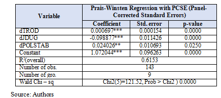 Since our model exhibits autocorrelation, heteroskedasticity, and cross-sectional dependence, we will use the Prais-Winsten method (xtpcse dGDPpc dTROD dJDUG dPOLSTAB, correlation(psar1)) for the final interpretation of the results, as it corrects for the previously mentioned issues and is also reliable when working with unbalanced panel data.