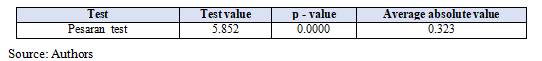 The null hypothesis of this test states that there is no correlation between the residual errors across different units in the panel, while the alternative hypothesis suggests that there is correlation between the residual errors across different panel units. Given the test result with a p-value of 0.000 (< 0.05), we accept the alternative hypothesis indicating the presence of cross-sectional dependence.