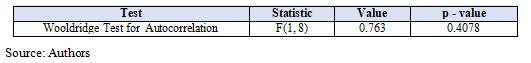 After selecting the model, we proceeded with testing it for the presence of heteroskedasticity, autocorrelation, and cross-sectional dependence among entities in the panel data. The first test was conducted to check for autocorrelation using the Wooldridge test, one of the most commonly used tests for detecting first-order autocorrelation in panel regressions.