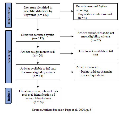 As illustrated in the flow diagram for literature selection (Figure 1), the search initially identified 122 studies and articles. By applying the established selection process through five levels—title, keywords, abstract, relevance of the topic, and conclusions—the number of relevant studies was narrowed down to 23, which were analyzed in detail and synthesized in this review.