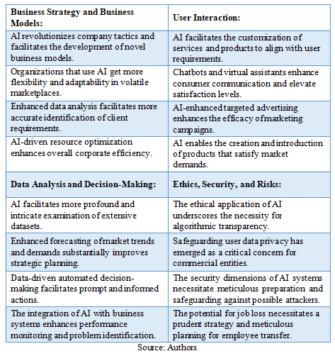 The analyzed literature emphasizes that AI contributes to contemporary business by increasing efficiency, supporting better decision-making and services, and creating competitive advantage (Dash, McMurtrey, Rebman, & Kar, 2019; Mihajlović & Todorov, 2024). At the same time, it also faces challenges in relation to legal, social, ethical, economic, and regulatory aspects (Di Vaio, Palladino, Hassan, & Escobar, 2020; Krunić et al., 2023).